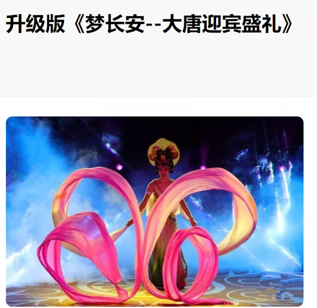 《夢長安——大唐迎賓盛禮》是世界唯一的以盛唐禮儀文化為主題的旅游文化演出,是中國僅有的國賓級迎賓儀式,以行進(jìn)體驗式的表演形式,堪稱“天下第一禮”。1996年在世界古都大會首次正式亮相,自2014年提升演變?yōu)槌菈ζ放莆幕莩,接待過美國總統(tǒng)克林頓、新加坡總理吳作棟、印度總理莫迪等貴賓,享譽(yù)海內(nèi)外。