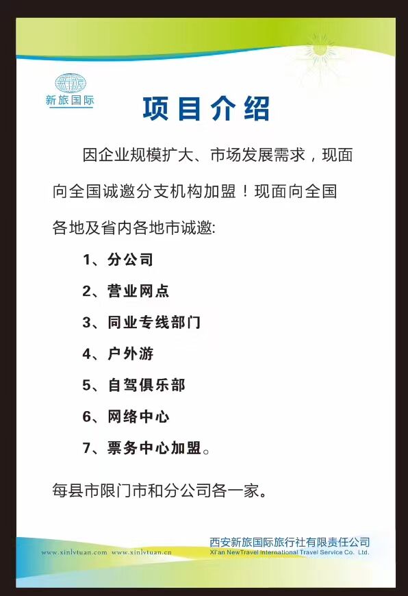 【西安新旅國(guó)際旅行社】免費(fèi)加盟;輕松賺錢!管理規(guī)范靈活;運(yùn)作便捷高效;免費(fèi)加盟;無人頭費(fèi),無操作費(fèi);不限定供應(yīng)商;利潤(rùn)全部在門店;熱線029-87209016,13572272331微信:a525565692