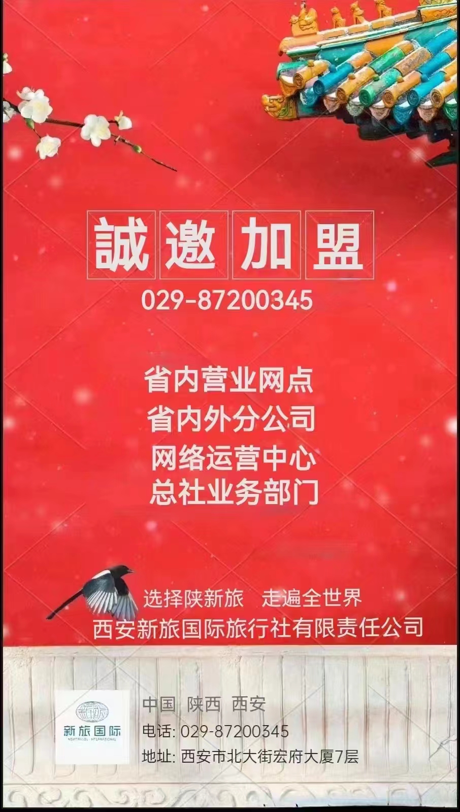 單位名稱:西安新旅國(guó)際旅行社有限責(zé)任公司  地址:西安北大街宏府大廈7層10730室