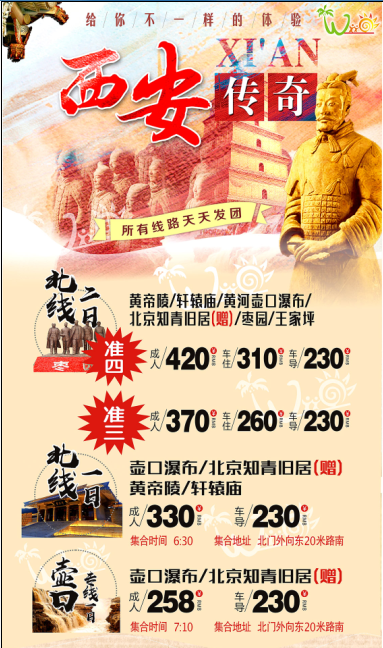 5、旅游產(chǎn)品豐富、種類齊全。竭誠為您提供以下服務(wù):提供陜西省內(nèi)旅游、國內(nèi)旅游以及國際接待旅游產(chǎn)品;為您提供自助旅游、團(tuán)隊旅游線路策劃設(shè)定;為您提供酒店預(yù)訂、旅游包車、導(dǎo)游委派等;為您待定機(jī)票、火車票、大巴、輪船等各種交通票務(wù);承辦各種會議、展覽、專業(yè)團(tuán)體考察、學(xué)術(shù)交流、商務(wù)活動等。