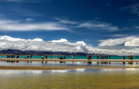 早餐后乘車延青藏線西行轉北赴西藏三大圣湖之一的【納木措】(游覽時間1小時)——海拔4718米,它是世界上海拔最高的咸水湖,它位于唐古拉山脈西南腳下,有如鑲嵌在藏北草原上一顆無暇的翡翠。湖的盡頭是白雪皚皚連錦的雪山,和藍天下茵茵草地,朵朵羊群以及帳篷里飄出的裊裊欽煙,象是到了遠離城市喧器的仙境。之后返回拉薩。西安旅行社西藏旅游 西藏旅行社到西藏旅游 西安旅行社拉薩旅游 西安旅游公司西藏拉薩旅游線路